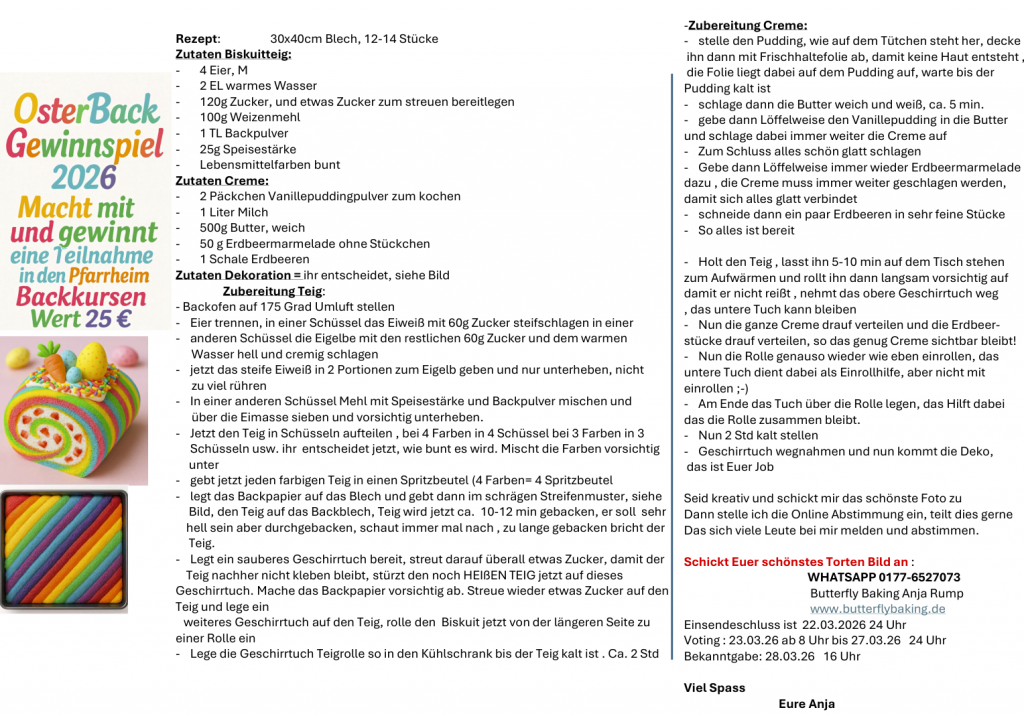 Ich veranstallte gelegentlich Back-Gewinnspiele, bei denen man eine freie Teilnahme an den Backkursen im Pfarrheim gewinnen kann. Dafür gibt es von mir immer ein Rezept, alle Teilnehmer müssen es nachbacken und mir dann ein Foto schicken. Die schönsten Werke werden dann öffentlich zur Abstimmung gegeben. Die gesamte Kommunikation dafür läuft über WhatsApp. Bitte schreibt mich unter 0177/6527073 an.